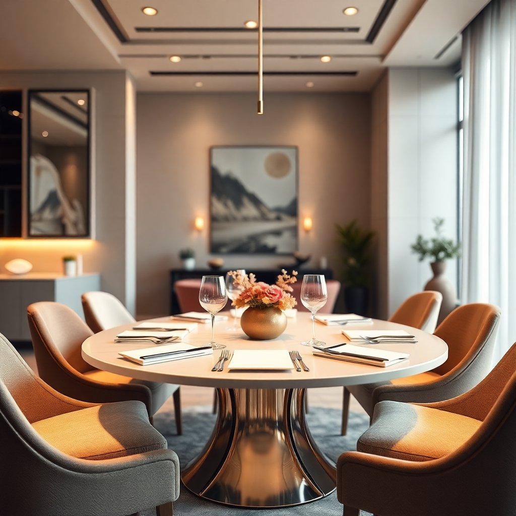 Современные обеденные столы также становятся более функциональными и адаптивными. Например, раскладные варианты обеспечивают гибкость и удобство, позволяя легко увеличить число мест во время торжественных мероприятий. Они идеально подходят для небольших пространств, где важно каждое сантиметр.